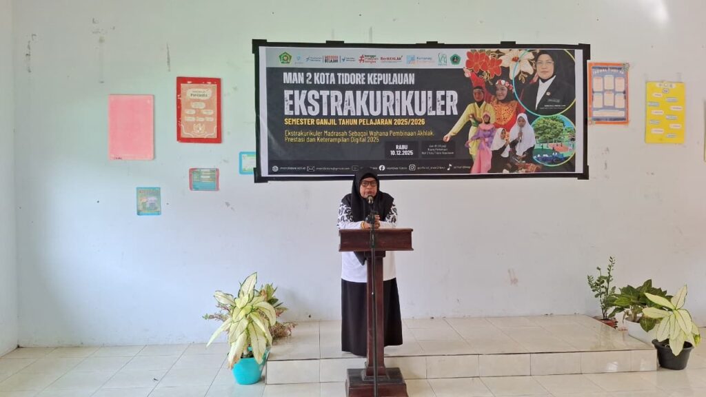 Tidore, Humas MAN 2 Tikep (19/12/2025) — Kegiatan Ekstrakurikuler MAN 2 Tidore Kepulauan yang telah berlangsung selama kurang lebih sepekan resmi ditutup pada Jumat (19/12). Kegiatan yang mengusung tema “Madrasah sebagai Wahana Pembinaan Akhlak, Prestasi, dan Keterampilan Digital 2025” ini diikuti oleh seluruh wakil kepala madrasah (Wakamad), dewan guru, serta seluruh siswa-siswi MAN 2 Tikep dan dipusatkan di ruang pertemuan MAN 2 Tikep.