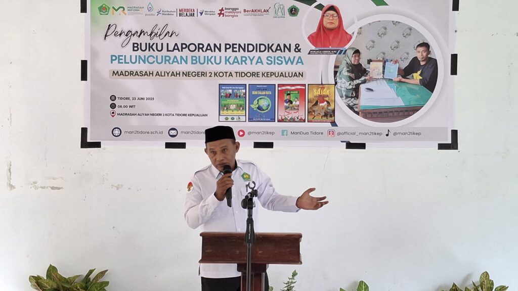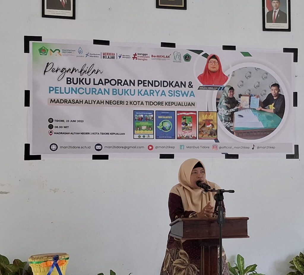 Tidore, HumasMAN2Tikep (23/06/2025) – Suasana Aula MAN 2 Kota Tidore Kepulauan pada Senin pagi dipenuhi dengan rasa bangga dan kemeriahan . Dalam rangkaian kegiatan Penerimaan Buku Laporan Pendidikan Semester Genap Tahun Ajaran 2024/2025, madrasah juga secara resmi meluncurkan 2 buku karya siswa-siswi MAN 2 Tikep
